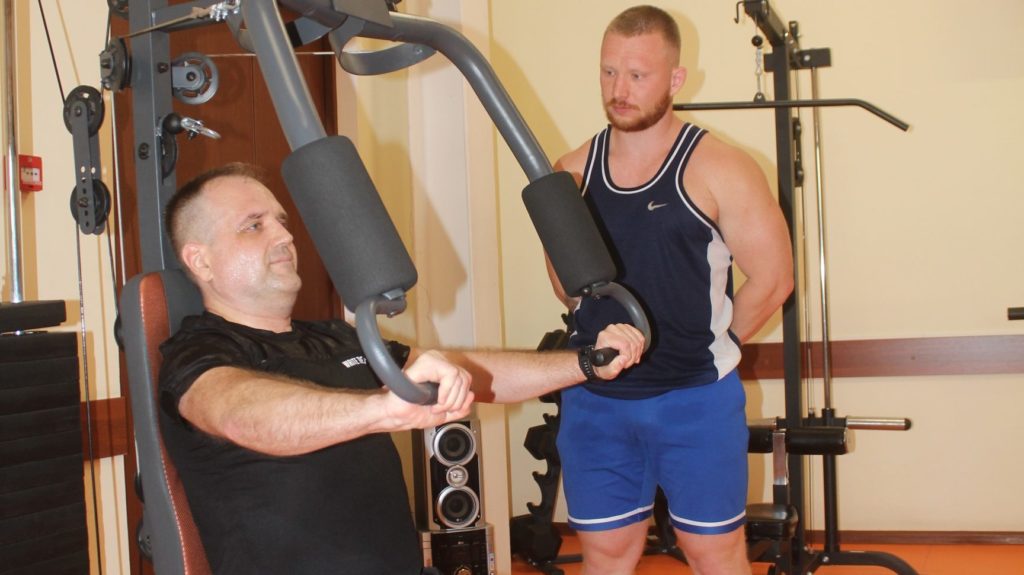 Михаил (на фото слева) посещает тренировки уже три года. Говорит, что сидячая работа требует компенсации в виде физической активности. Для него главное – ходьба на беговой дорожке, но и силовыми упражнениями мужчина не пренебрегает.