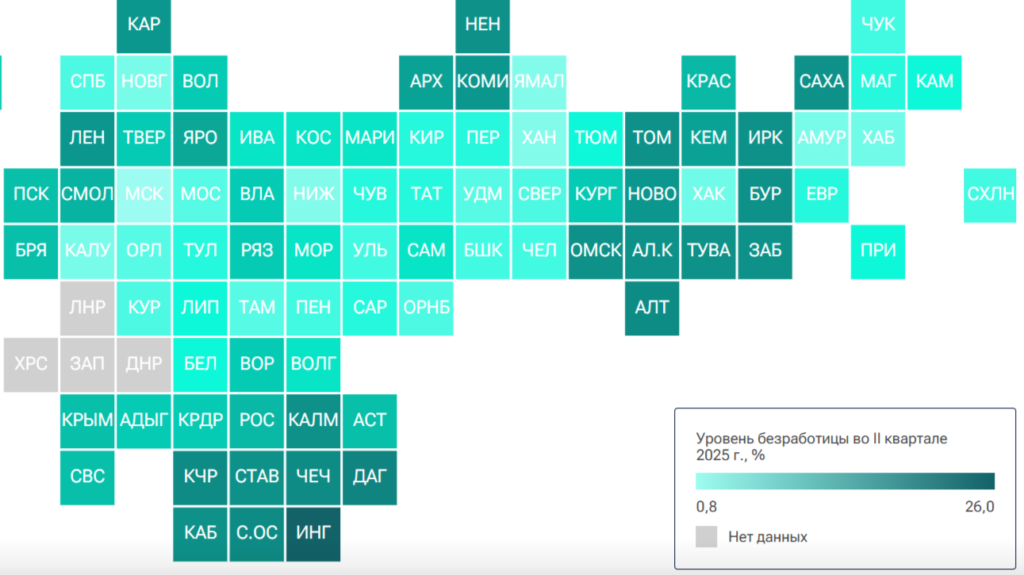 Самый высокий уровень безработицы отмечен в Республике Ингушетия. Здесь живут 26% людей трудоспособного возраста, не имеющих работу.