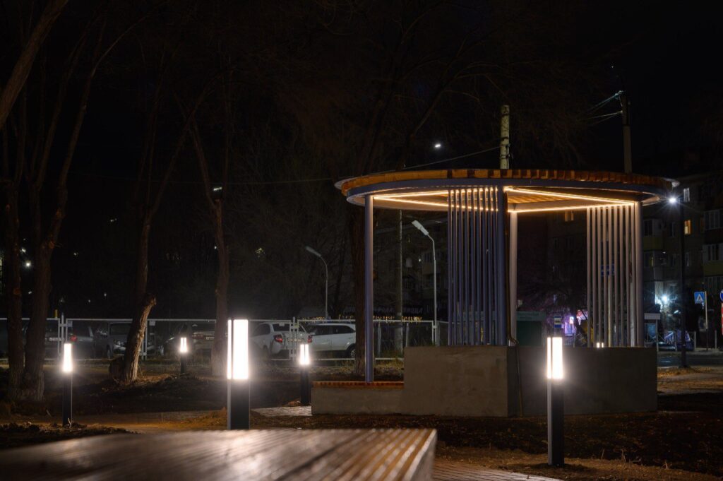 В центральной части площади создана событийная зона с открытой площадкой и сценой. По периметру установлен овальный модульный навес с местами для отдыха. Вблизи музейно-выставочного комплекса появились музейная и молодежная площадки с амфитеатром, а также сад-читальня. Особое внимание уделили освещению – светильники установлены по всей территории, включая беседки.