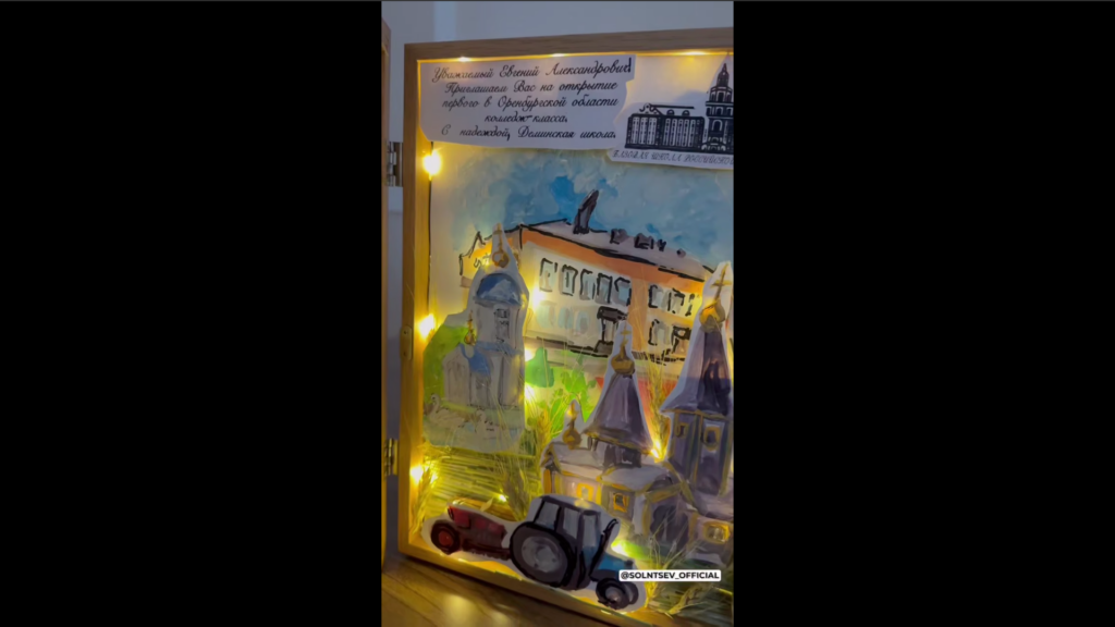 Последняя полная рабочая неделя перед Новым годом началась для губернатора Оренбуржья с приятного события. Учащиеся Деминской средней школы из Пономарёвского района передали Евгению Солнцеву в подарок картину, которую нарисовали сами. На ней ребята изобразили родные для них места: свою школу, церковь Рождества Пресвятой Богородицы, родник в честь Рождества Предтечи и Крестителя Господня Иоанна, а также трактор — символ плодородного Пономарёвского района. В дополнение к картине ребята написали главе региона приглашение на открытие первого в Оренбуржье колледж-класса.