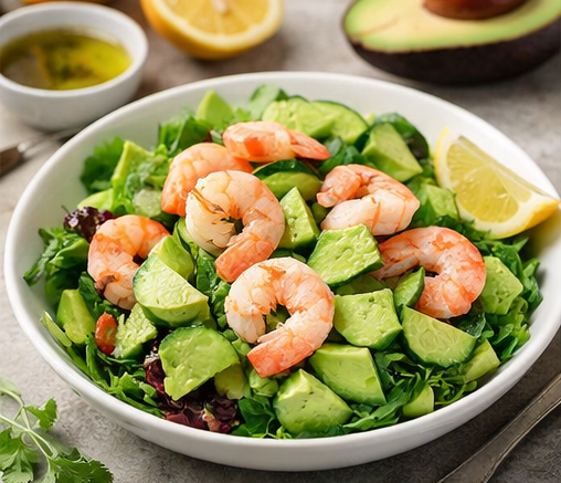 Этот салат выглядит празднично, готовится за 10 минут и идеально подойдёт в качестве лёгкой закуски. Авокадо содержит полезные жиры, креветки — лёгкий белок, а огурец улучшает пищеварение.