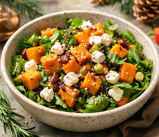 Идеальный вариант для зимнего стола — сытный, но не тяжёлый. Тыква улучшает обмен веществ, а фета придаёт вкус без лишнего жира.
