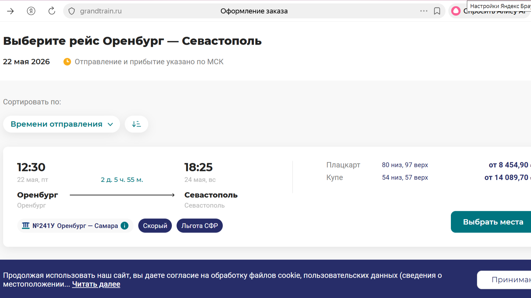 Первый рейс из Севастополя назначен на 19 мая в 00:15. Прибытие в Оренбург ожидается в четверг 21 мая утром в 08:40. Отправление из Оренбурга предварительно запланировано на пятницу 22 мая в 14:30. Цена на место в плацкарте – 8454 рубля.