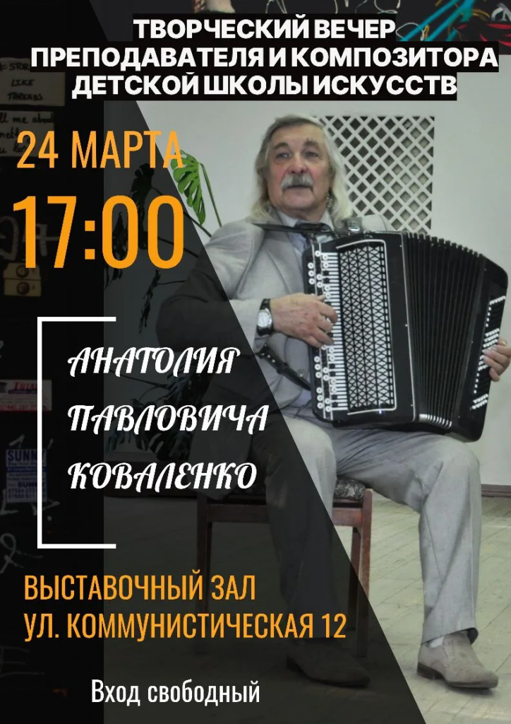 В Гае пройдет творческий вечер преподавателя детской школы искусств по классу баяна и композитора Анатолия Коваленко. Мероприятие под названием «Мастерство и вдохновение» состоится 24 марта в городском выставочном зале (0+).
